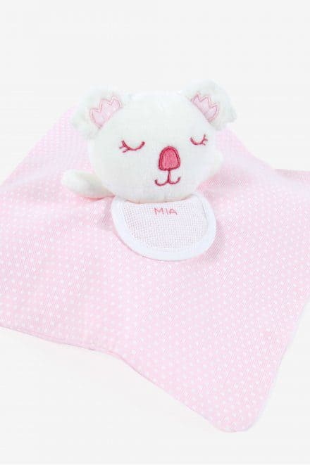 Este adorable koala rosa doudou hará felices tanto a los niños como a las niñas. Su babero en tela Aida 7pts/cm te permite bordar en punto de cruz una fecha de nacimiento, un nombre, un motivo… Es muy suave con su cabeza de terciopelo y su tela estampada con lunares. Ayuda a despertar los sentidos del bebé, es ideal para acurrucarse. Maravillosa idea de regalo para el bebé que lo convertirá en su compañero favorito.